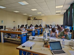 Me resultaron especialmente interesantes las clases de TP (Travaux Practiques) de física y química, lo que son prácticas de laboratorio, por su gran diferencia con respecto a cómo se plantean aquí. El principal motivo de esta diferencia, sobre todo en terminale, es que van enfocadas a la preparación del examen práctico de bac y su correspondiente evaluación y calificación. En el laboratorio, los alumnos tienen una autonomía mucho mayor en lo que a manipulación de material, equipos y realización de los experimentos. Las sesiones tienen una duración de 2 horas, teniendo en total 6 horas de Física y Química a la semana (2 horas de prácticas y 4 horas de teoría). Van alternando, una semana realizan una práctica de física y a la siguiente de química.